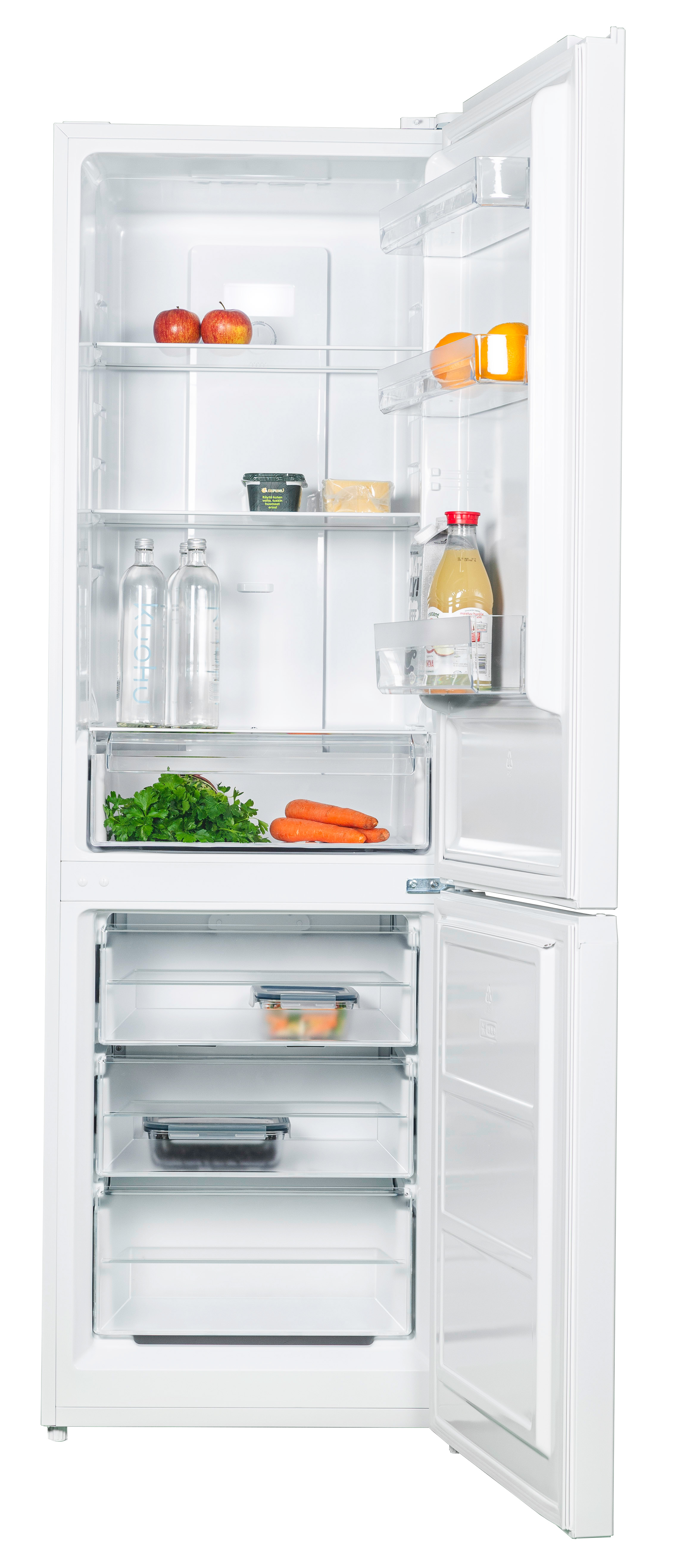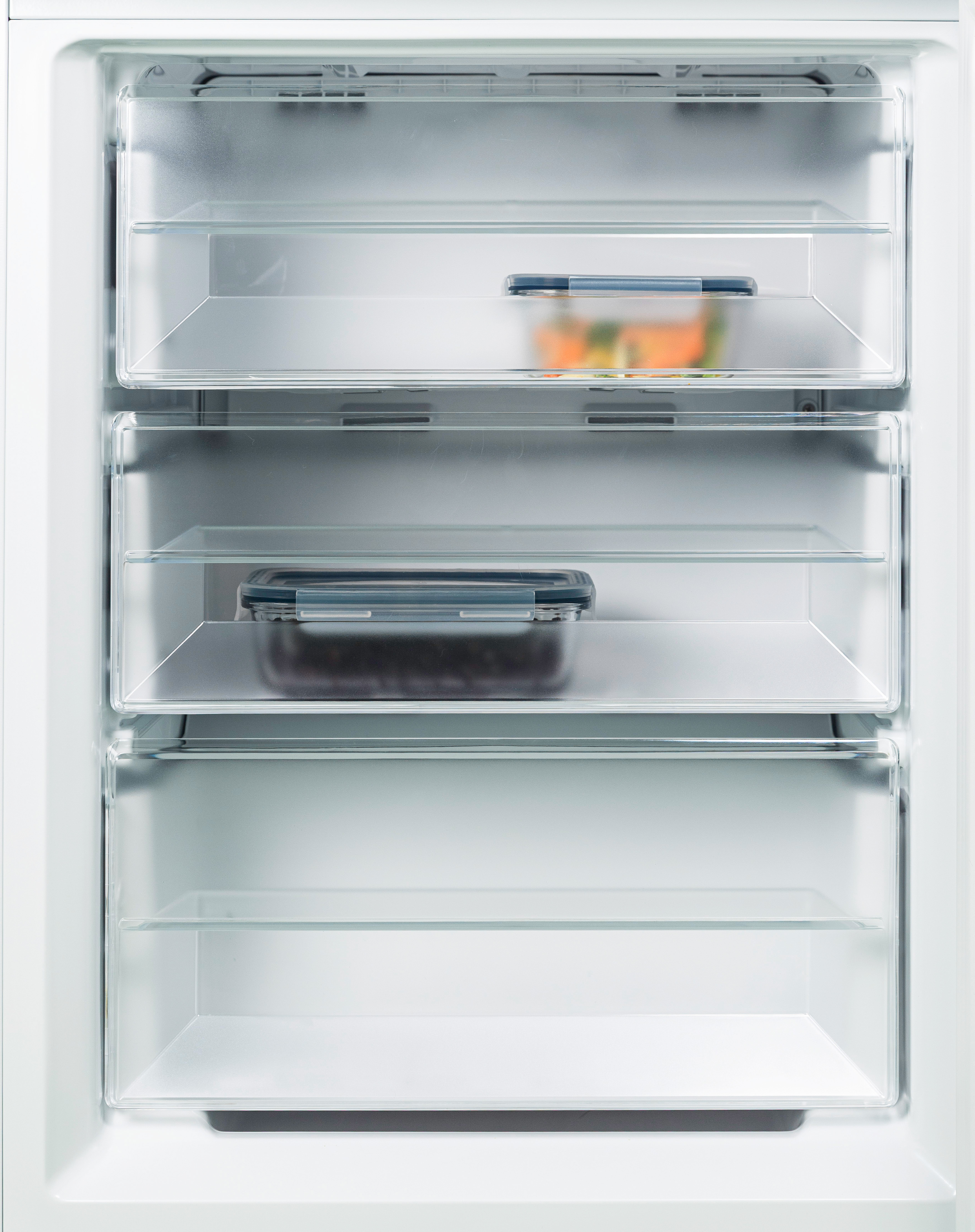 60 cm leveä NoFrost jääkaappipakastin, jonka korkeus on 186 cm. Laitteessa on digitaalinen lämpötilansäätö ja MultiCooling-ilmankierto, joka takaa tasaisen viileyden. Jääkaapissa neljä lasihyllyä, vihanneslaatikko sekä tilavat ovihyllyt. Pakastimessa kolme käytännöllistä laatikkoa. Ovissa integroidut kahvat ja kätisyys on vaihdettavissa. Energialuokka E.