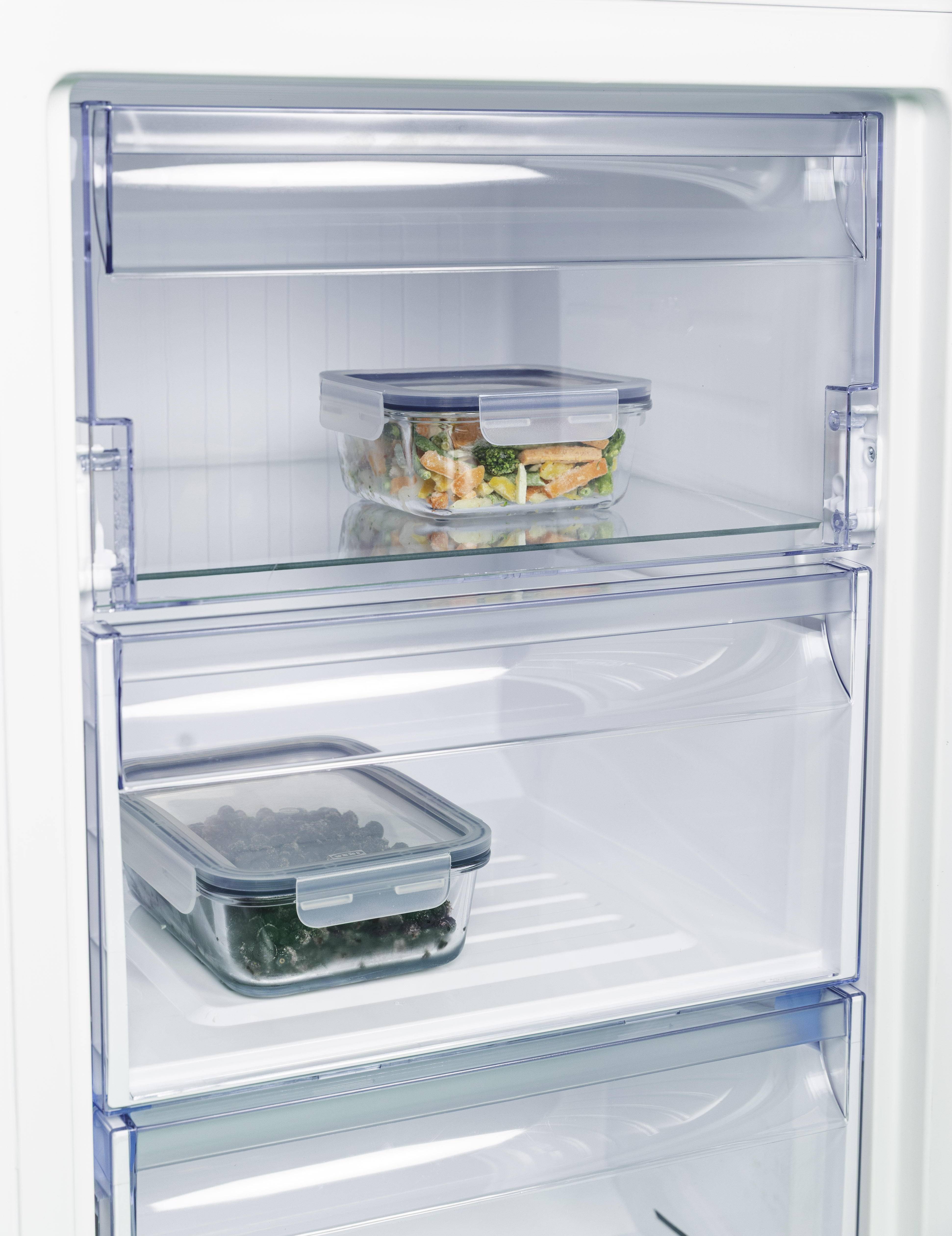 Tyylikäs ja tehokas pakastin, jossa tilavat laatikot ja vaihdettava kätisyys.